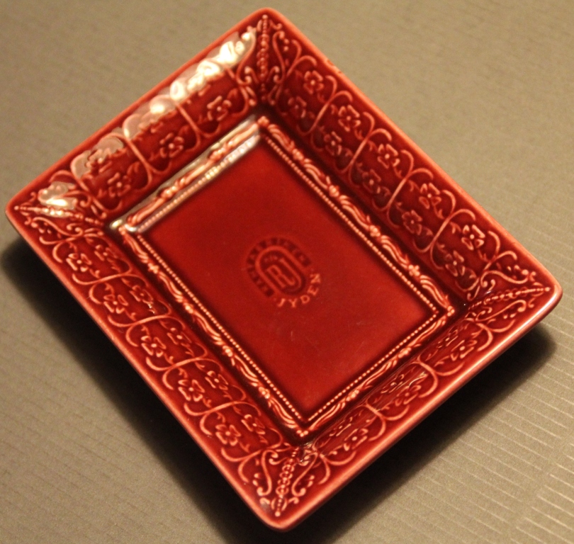 Bild 006Ännu mer reklam. Ett litet (ask)fat med logga för Ramfabriken Jyden i Strömstad. Fatet ser också ut som en tavelram och håller hög klass för att vara en reklamgrej. Det är tillverkat av Rörstrand. Jydens har haft en stor ramproduktion men jag är osäker på om de finns kvar. Hittar iallafall ingen hemsida.