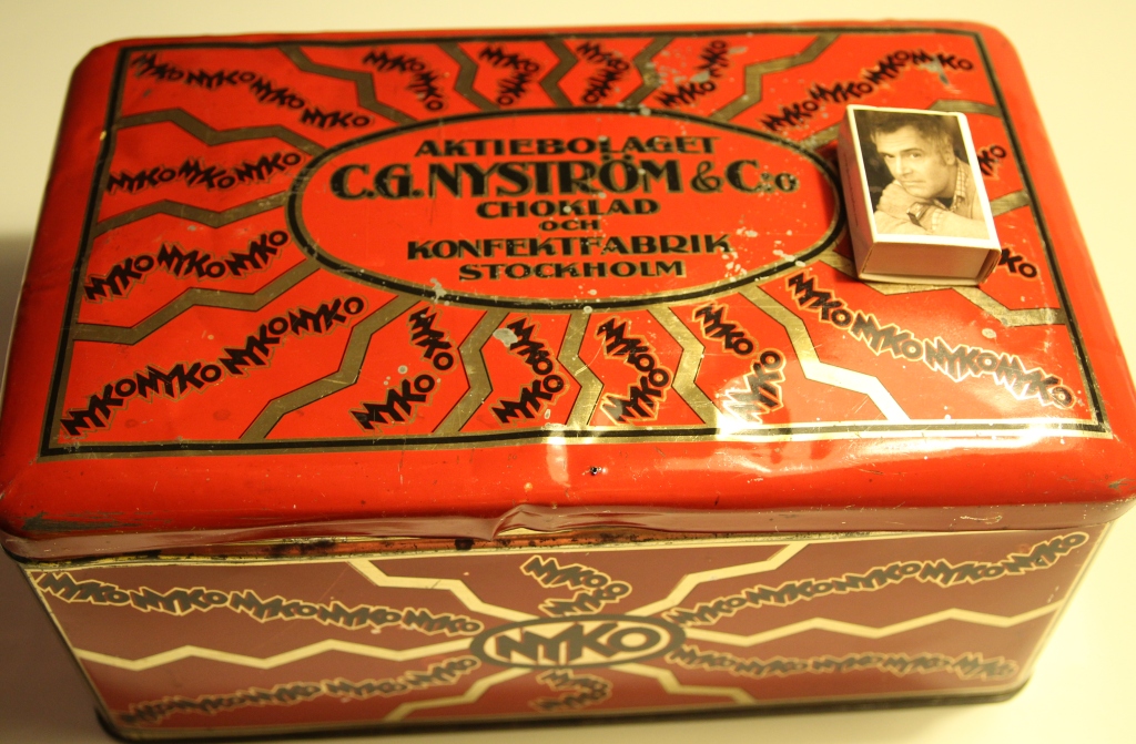 Bild 009Svärmor gav mig detta tjusiga plåtskrin från Aktiebolaget C.G. Nyström & Co Choklad och konfektfabrik Stockholm (NYKO). Hittar inget på nätet om denna fina fabrik. På skrinet ligger kompisen Ernst i form av en tändsticksask.