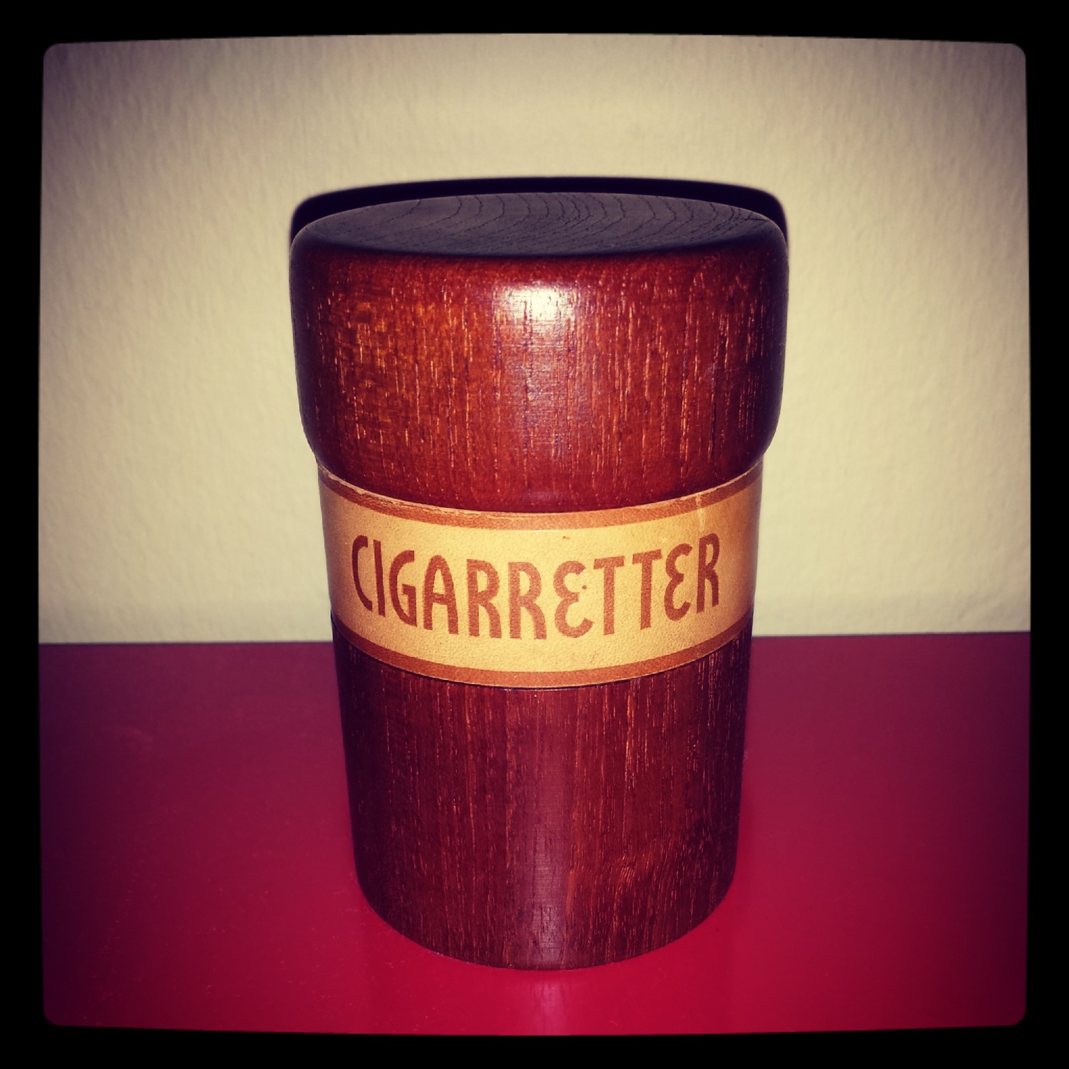 IMG_20131113_180546Tomte och julflaggor. När jag försökte tvätta bort stearinet från tomten förjde den röda färgen med också. Så kan det gå!IMG_20131113_091559En mycket praktisk teakburk med lock. Snyggt typsnitt också. Fast det tänkta innehållet är ju sådär……..