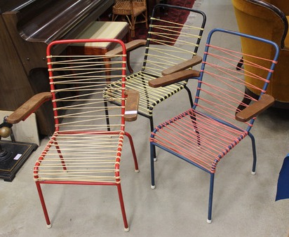 Detta är precis den rätta säsongen för att förvärva trädgårdsmöbler (av samma skäl som att man inte ska förvärva jultomtar på denna tid av året). De här tre stolarna från 50-talet var ju riktigt läckra. Misstänker att plastbanden kan skära in en del i celluliterna men ändå…. 😉 Utrop 500 kr.