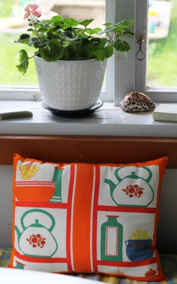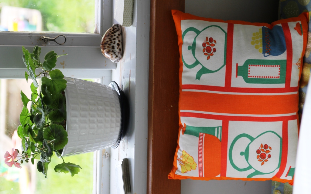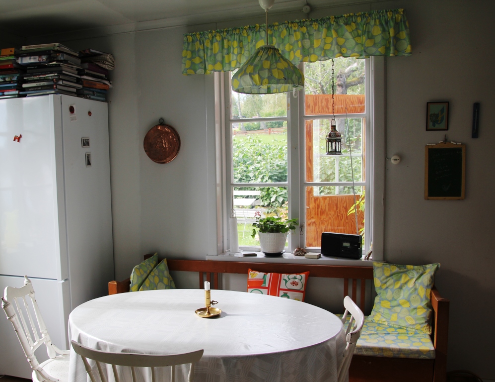 Annan vinkel. Större Gunillakruka och fin kudde från Randiga Tråden. Ser nu hur ledsamt mitt ”retro”tyg från Ikea ser ut. Behöver definitivt nytt. Är det någon som vet var man köper ett tyg med liknande färger (ljusblått o gult) typ 8 meter? Makens kokböcker är parkerade ovanpå kylen. Dörren öppnas på egen risk!
