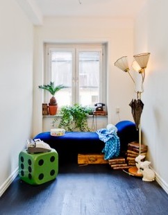 Snyggt med turkosblått, svart och mörkt trä!