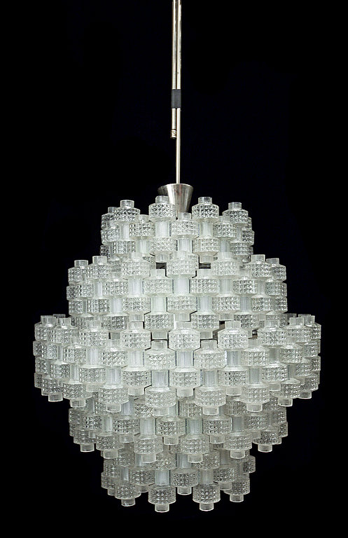 Den sista lampan är från Orrefors/Fagerhult och består av 180 glascylindrar på stålstomme. Den har 30 ljuskällor. Sjäva lampan är 85 cm hög. Pendel tillkommer. Buden är nu uppe i 21 tkr (BM 17 okt). Lite ovanför min budget 🙂 Men den är snygg!