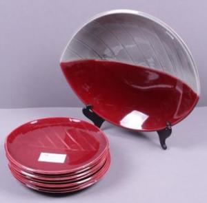 Här är ett fruktfat med 7 assietter från Rörstrand. Det är väl California av Carl-Harry Stålhane? Kan kanske vara något för Trillivippa på Porslinan? Utrop 150 kr.