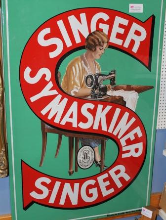 Fin emaljskylt från Singer. Kanske nåt för Brittmari på Randiga Tråden? 89×53 cm. Ganska stor. Lite kantstött men för utropet 200 kr så står man nog ut med det.