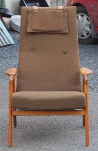 Den här fåtöljen är av Yngve Ekström (1913-88). Ni vet han med Laminofåtöljen. Den här är tillverkad av Swedese (brännmärkt). Själva fotställningen är i teak. Tyget verkar ju vara i hyggligt skick men det är ju urtrist rent ut sagt. Men byter man det så har man en toppenfåtölj. Det var Yngve Ekström som tillsammans med sin bror startade Swedese 1945. Inget utropspris är satt.