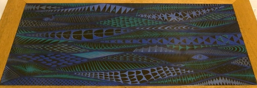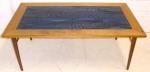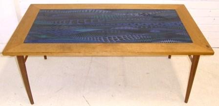 Det här är ett emaljbord. Emaljskivan är av Stig Lindberg. Träslaget i bordet verkar lite tråkigare. Ek kanske. Utropet är 4000 kr.