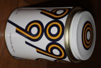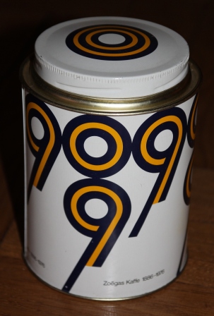 En plåtburk för Zoegas kaffe 90-årsjubileum 1976. Mycket tidstypiskt formspråk.