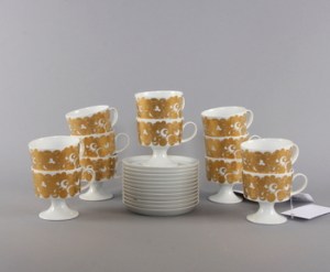 4. En stilig kaffeservis i vitt och guld från Rosenthal Studio-linie. Den är designad Tapio Wirkkala. 12 kaffekoppar med fat och assietter, en kaffekanna, en sockerskål samt en mjölkkanna ingår. Så 70-tal……Högsta bud just nu är 900 kr (4 mars).
